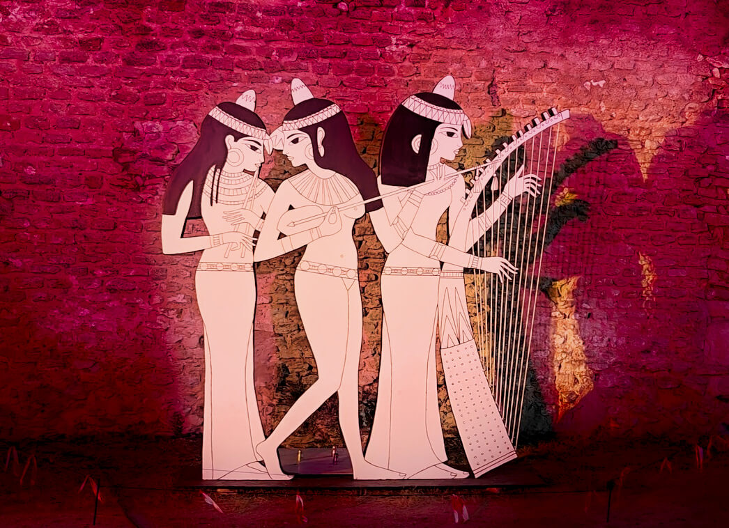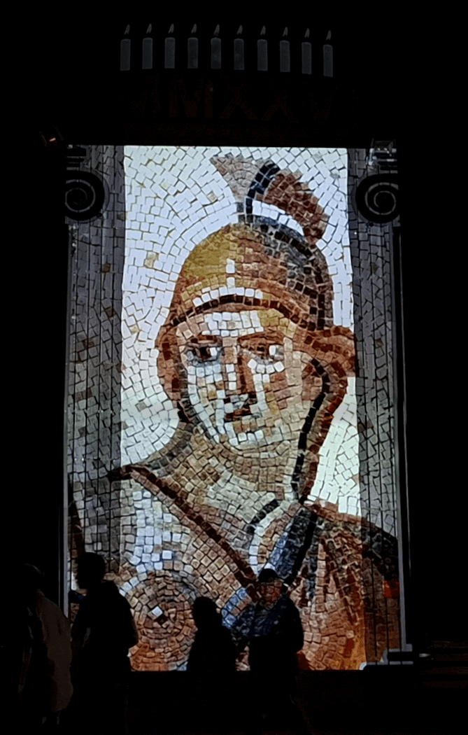 Pour cette 10ème édition, avec Nicolas de ADN System nous avons surélevé le 1er belvédère du site au moyen d’un écran en tulle (2 x 3,5m) et projeté un montage vidéo évoquant l’antiquité sur la face de l’édifice. Nous avons également mis en lumière les vestiges du mur antique devant lesquels étaient placées mes silhouettes de personnages antiques.